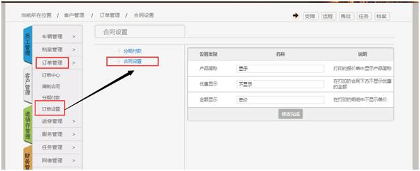 使用订单管理功能需要先进行合同设置,例如不显示优惠项,不显示单价与金额,只显示总价,或者是显示产品简称而不是显示产品全称,如下图所示: