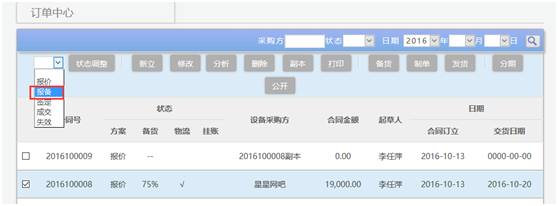 经销商与供货商达成报备协商后在此处将状态调整为报备,在业务跟进处也会有所体现,处于报备状态的合同订单将不允许在业务跟进处进行修改