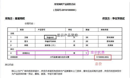 比如咱们设置为产品显示为简称、显示优惠项、合同金额显示设置为显示总价,则打印出来的合同如下图: