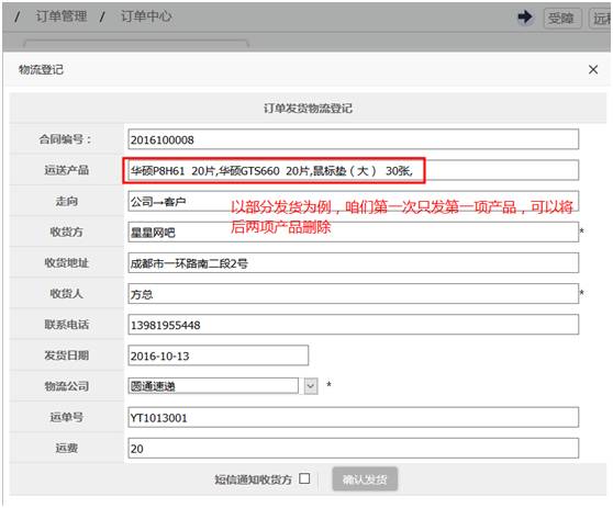 咱们以两次登记发货信息为例,第一次只发送主板,同时支付了20元的运费,将其他两项产品信息删除进行发货登记