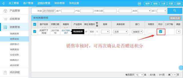 ♦ 销售审核时可再次确认是否给该单赠送积分,若此单因成交价较低而不赠送积分,可在销售审核时取消积分选项。