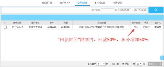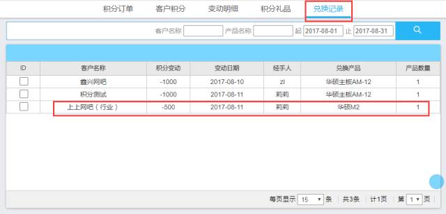 兑换前,可在“客户积分”处查看到所有积分会员的积分累计情况,并可查询积分变动明细,如果积分有误可手动调整积分。