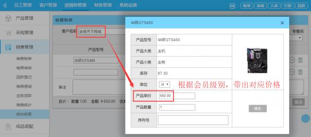 前台收银、销售制单、创建订单时,均可根据会员等级带出对应价格。前台收银支持扫描产品条码,实现快速收银。